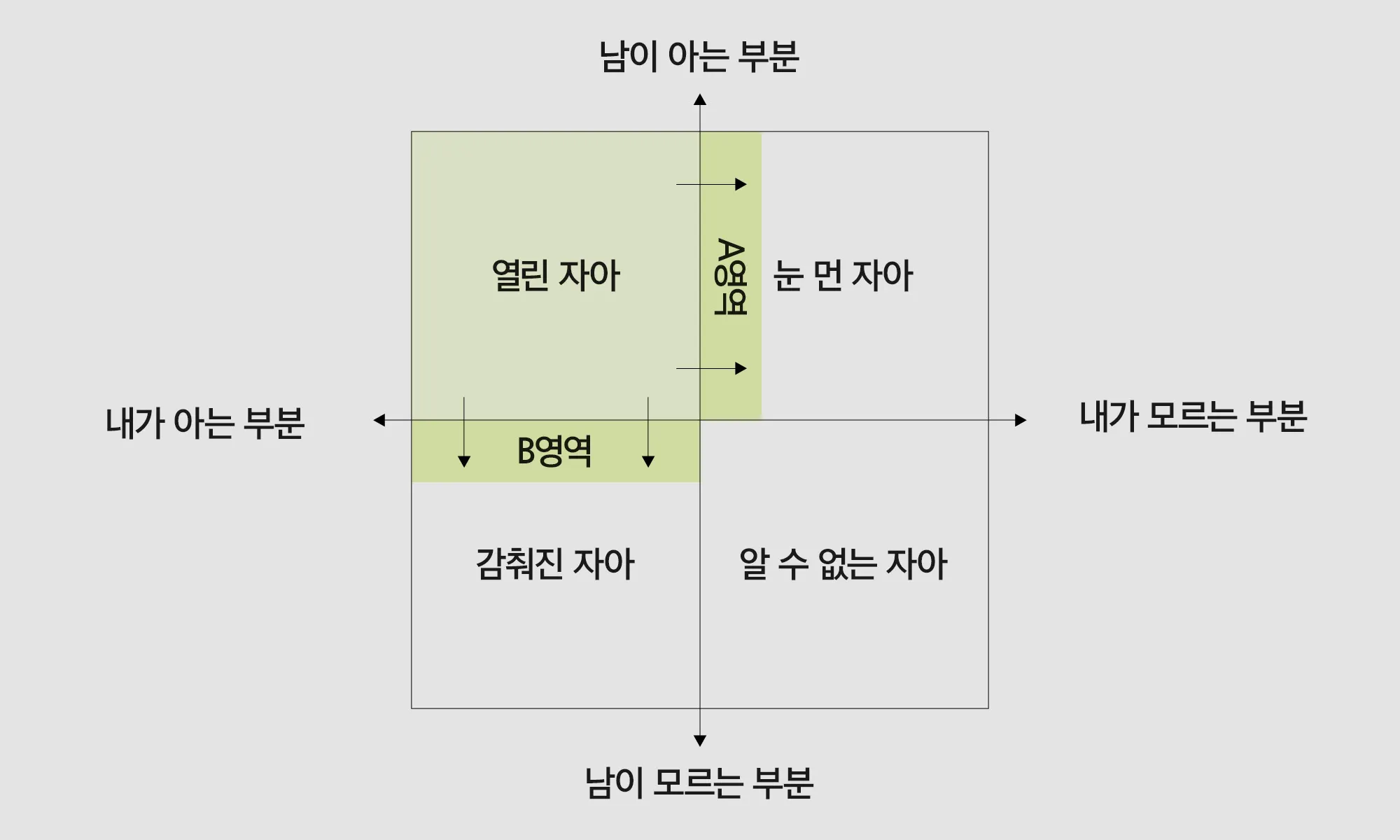 평판에 대해 심도있게 다루고 있는 책 『신뢰가 전부다』에 따르면, 평판관리는 A영역과 B영역을 넓히려는 노력이라고 해요. 눈먼 자아와 감춰진 자아를 파악해 열린 자아를 늘려가는 거죠.