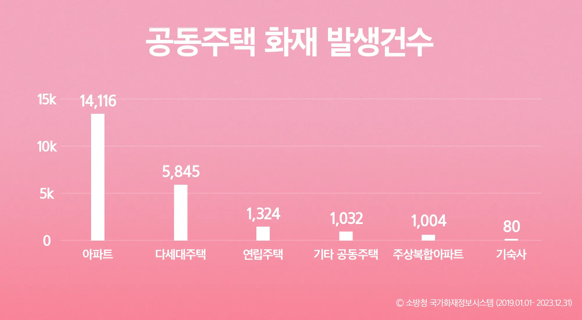 최근 5년간의 공동주택 화재 중 아파트에서 일어난 화재만 약 14,116건으로 과반 이상을 차지해요. 아파트는 구조적 특성 때문에 화재 발생 시 불길이 커질 위험이 커요. 또한 계단이나 복도, 승강로 등을 통해 연기가 빠르게 퍼지면서 대피가 어려워지죠.