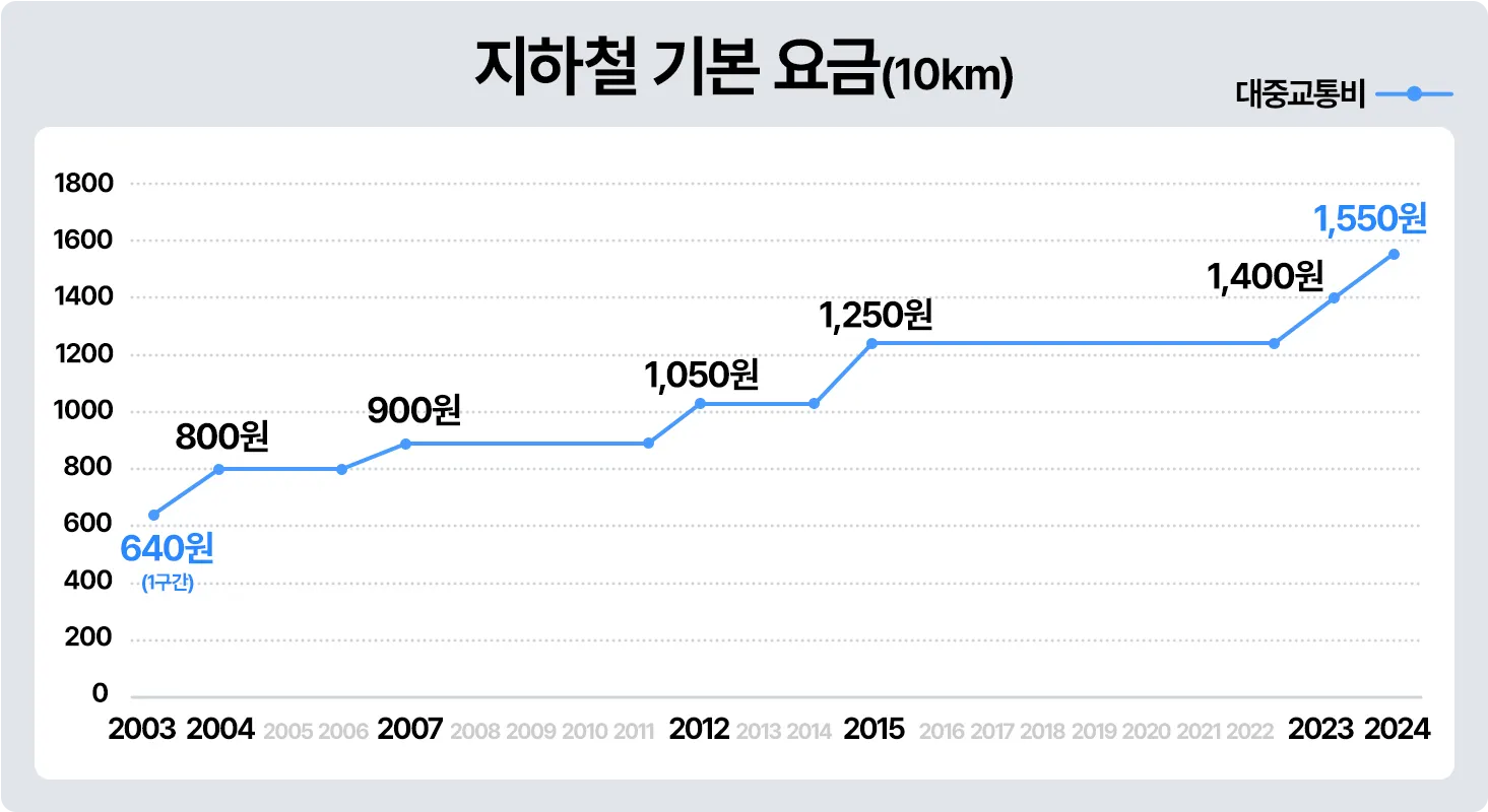 지하철 기본요금 기준(10km)으로 2003년에는 640원이었고, 2015년까지 조금씩 상승했던 것으로 확인됩니다. 그러다 2015년을 기점으로 고정된 기본요금 1,250원이 2023년까지 유지된 것이죠. 결국 20년간 총 910원이 올랐다는 것을 확인할 수 있습니다.