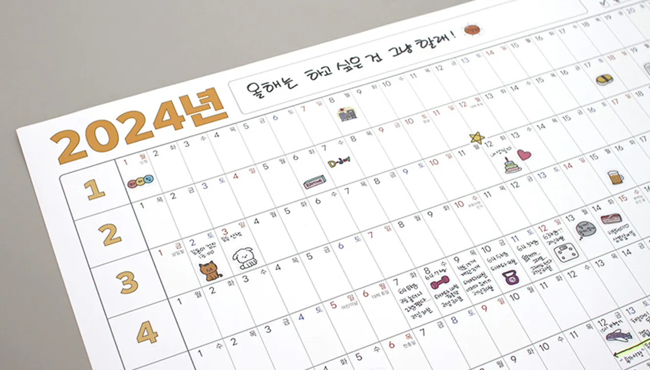 매일의 세밀한 기록도 좋지만, 일년을 한 눈에 보고 싶진 않으신가요? ‘연력’은 포스터처럼 벽에 붙여놓고 1년동안 사용할 수 있는데요. 한해의 목표를 잡아두고, 꾸준히 다짐을 실천하는 것에 도움이 돼요. 한 장에 365일이 담겨있기 때문에 하루에 할당된 칸은 매우 작은데요. 계획을 적기보다 ‘실천한 날’을 기록하는 것에 초점을 맞춰 사용하면 좋을 거예요.