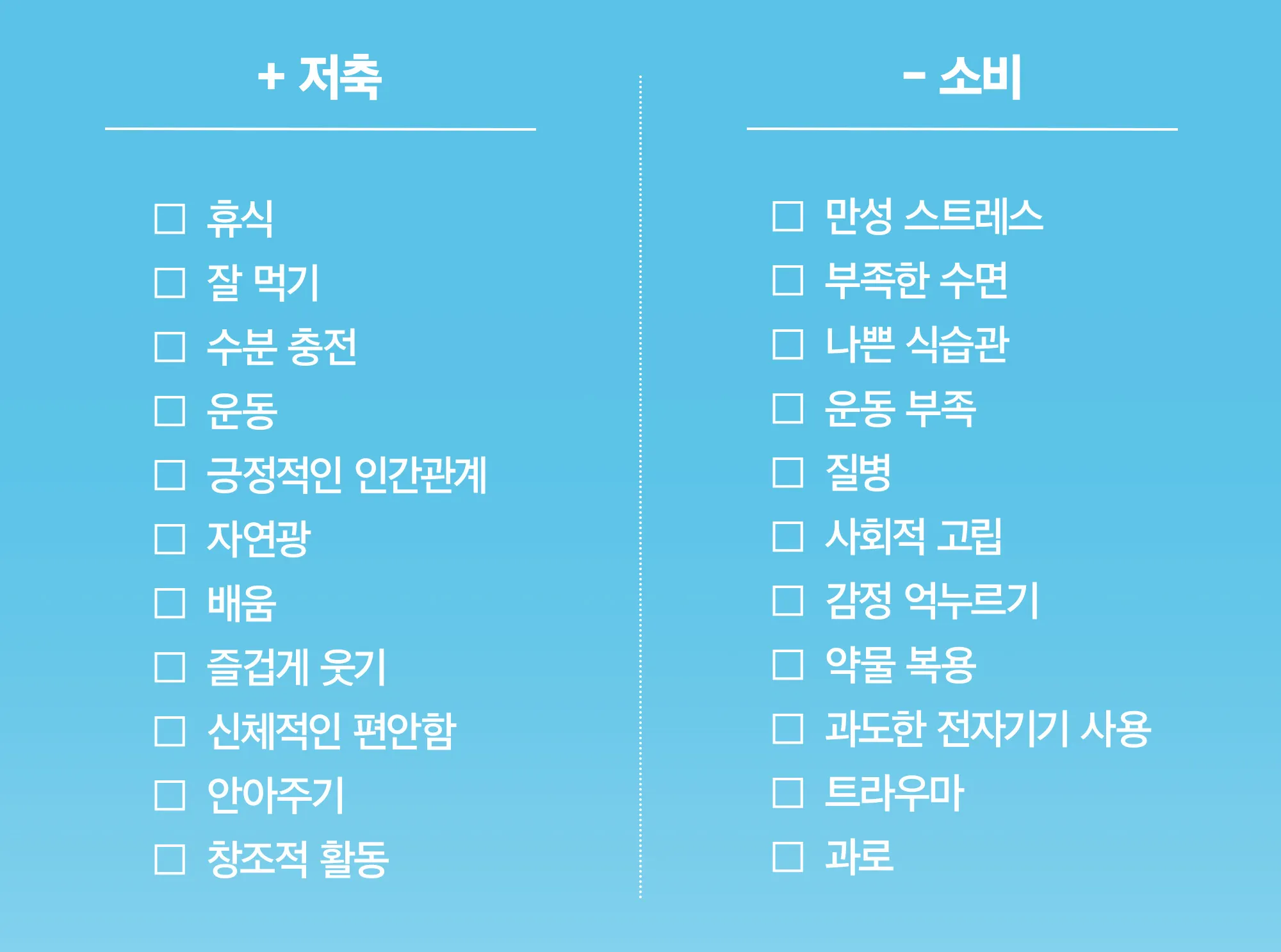 감정의 가장 중요한 재료 중 하나는 ‘몸’입니다. 우리의 몸과 마음은 본질적으로 서로 얽혀 있어서, 불안한 감정은 신체 감각에서 비롯된다고 해요. 몸의 요구를 알아차리는 건 정말 중요합니다. 엠마 헵번은 이러한 몸의 요구를 ‘신체 예산’이라고 표현했는데요. 소비와 저축을 통해 한정된 신체 에너지를 써야 한다고 합니다. 내 몸이 만성 스트레스로 적자 상태가 아닌지, 신체 예산을 어떻게 저축할 수 있을지 계산해 보세요.