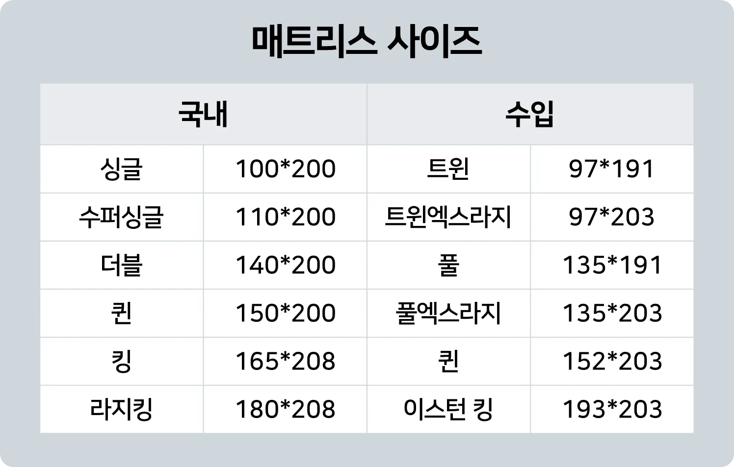 침구의 종류를 골랐다면 사이즈를 정해야죠! 침구 사이즈는 매트리스 사이즈의 5~10cm 여유가 있는 것으로 골라 주시면 됩니다. 매트리스의 사이즈는 제조사가 국내인지 수입인지에 따라 달라지기 때문에 정확한 사이즈를 알고 싶다면, 매트리스에 부착된 라벨을 확인해 보는 것이 가장 정확하답니다.