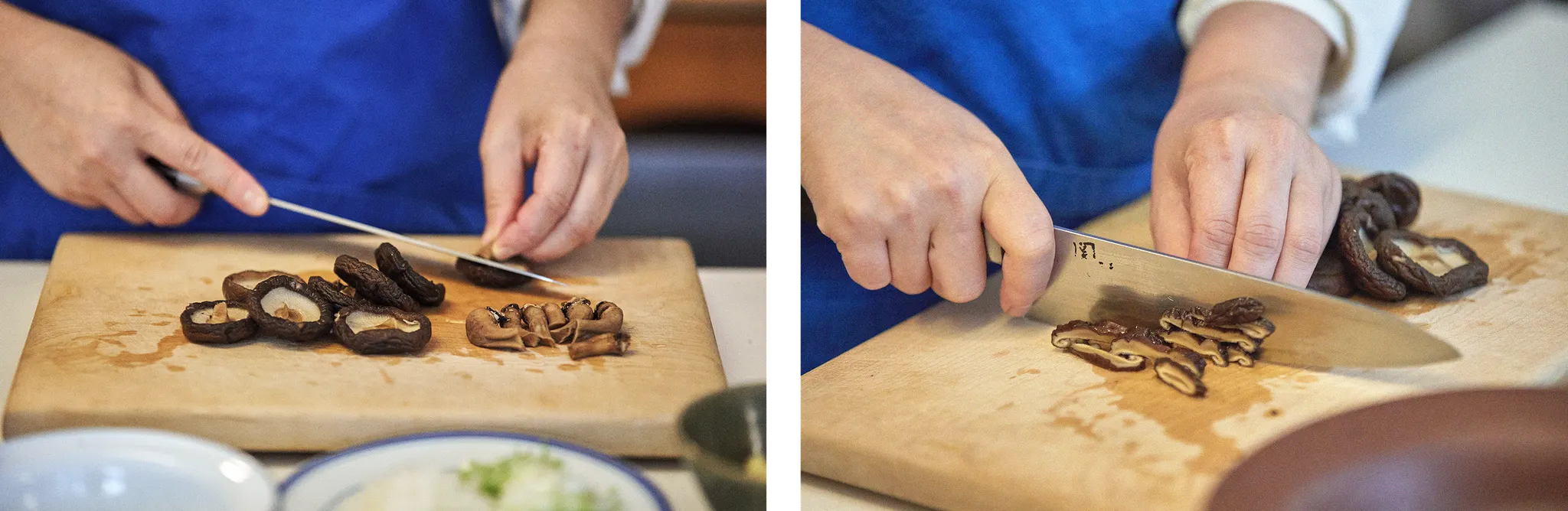 표고다시물을 만들고 남은 불린 표고버섯은 물기를 짜 가늘게 채썬다.