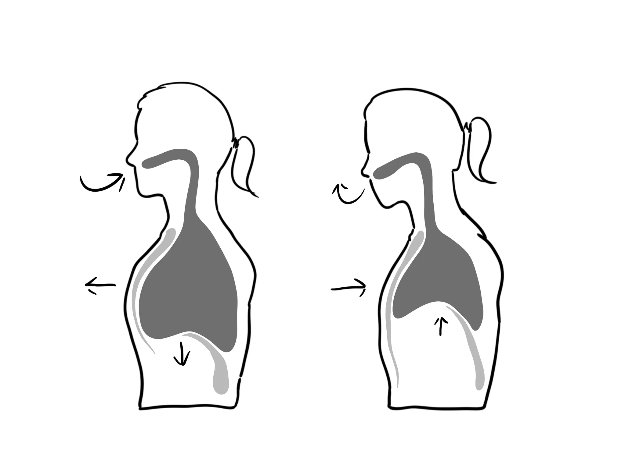 가슴과 흉곽은 과하게 오르내리지 않고, 배가 부풀어 오를 때 살짝씩 따라 올라가도록 한다.