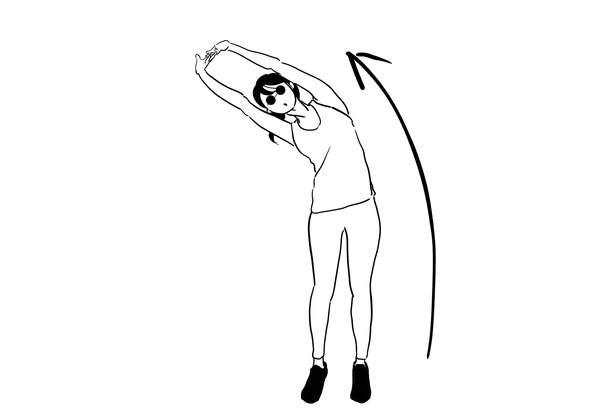 깍지 낀 팔을 천장 쪽으로 끌어 올려 주세요.