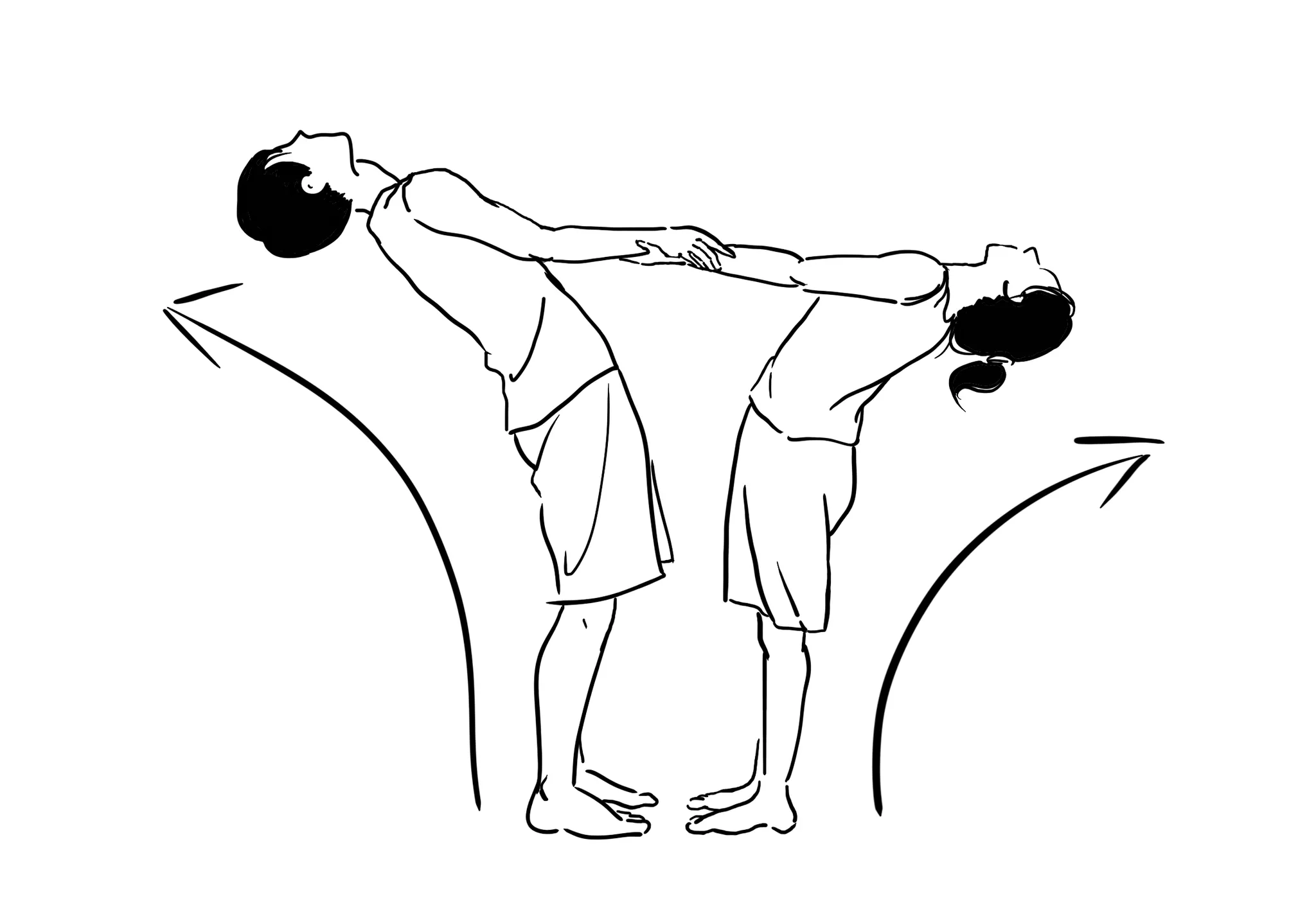 서로의 팔을 맞잡은 뒤 기대며 허리를 뒤로 넘겨 주세요.