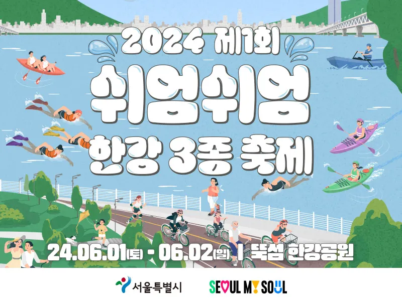 제1회 쉬엄쉬엄 한강 3종 축제가 이번 주말(6.1∼2) 뚝섬한강공원 일대에서 막을 올립니다. 주요 프로그램으로 한강 3종 경기(수영, 달리기, 자전거), FUN체험존(서울시민체력장, 한강요가 등), 쉬엄쉬엄나이트(한강드론라이트쇼, 무소음DJ파티 등)가 있는데요. 네이버를 통해 예약 가능하며, 당일 선착순 200명 현장 신청도 가능하니 참고하세요!
