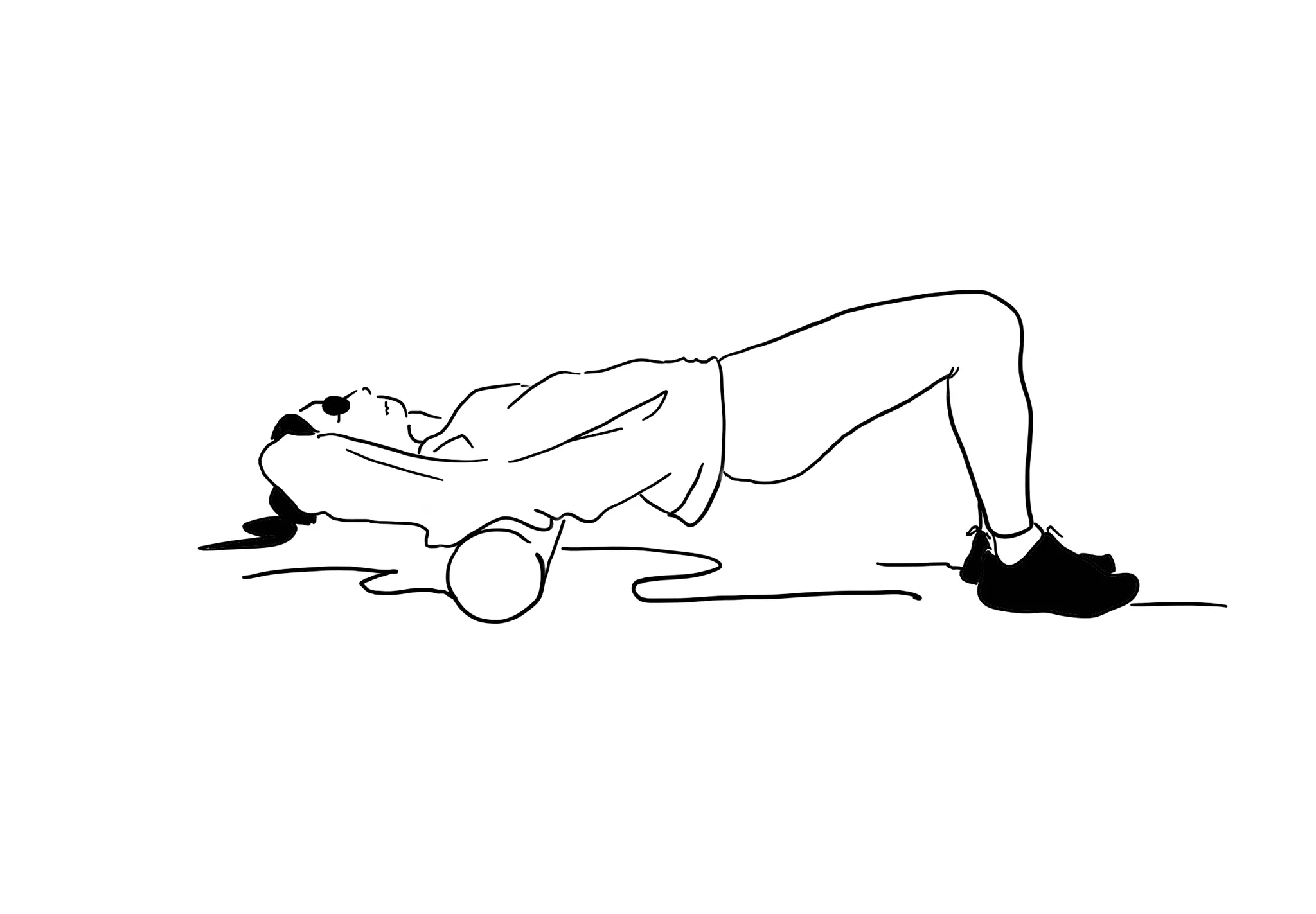 무릎을 골반 너비로 벌리고 등 중앙에 폼롤러를 가로로 놓은 후 중심을 잡아주세요.