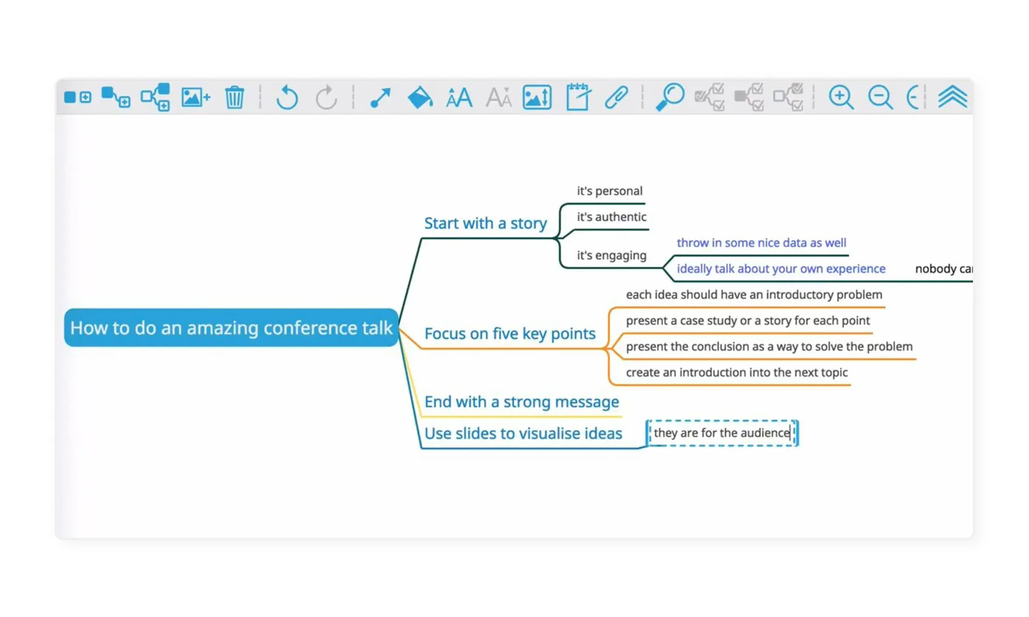 수집 툴에 메모를 모았다면, 이제 적재적소에 활용할 차례입니다. 생각을 정리하거나 발전시켜나갈 때는 마인드맵 형식의 툴을 추천할게요. 생각의 흐름을 한눈에 파악할 수 있어요. 예컨대, 회의에서 새로 논의된 이야기를 키워드별로 분류해 보세요. 그다음 구글킵에 수집해둔 메모를 연결하거나 각 항목에 관련된 자신의 생각들을 추가하다 보면 새로운 시야가 생길 수 있습니다.