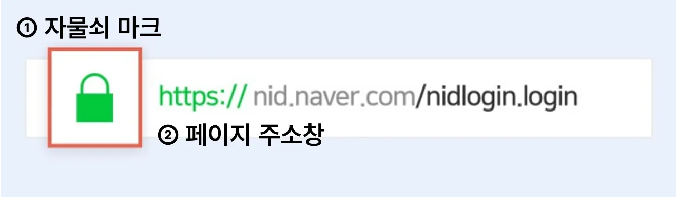 두 번째는 페이지 주소창. 저는 전에 이 얘길 듣고 많이 놀랐었는데, 많은 사람이 네이버에 접속할 때 구글 검색창에 네이버를 입력해서 들어간다고 하더라고요. 그건 너무 위험한 방법이에요. 자주 접속하는 페이지라면 주소를 외워 주소창에 직접 입력하길 추천해요. 해킹당하지 않으려면, 꼭 자물쇠 마크를 확인해 보고 페이지 주소창에 직접 사이트 주소를 입력한 다음 로그인하세요. 확인하는 데 30초도 안 걸려요.(웃음)