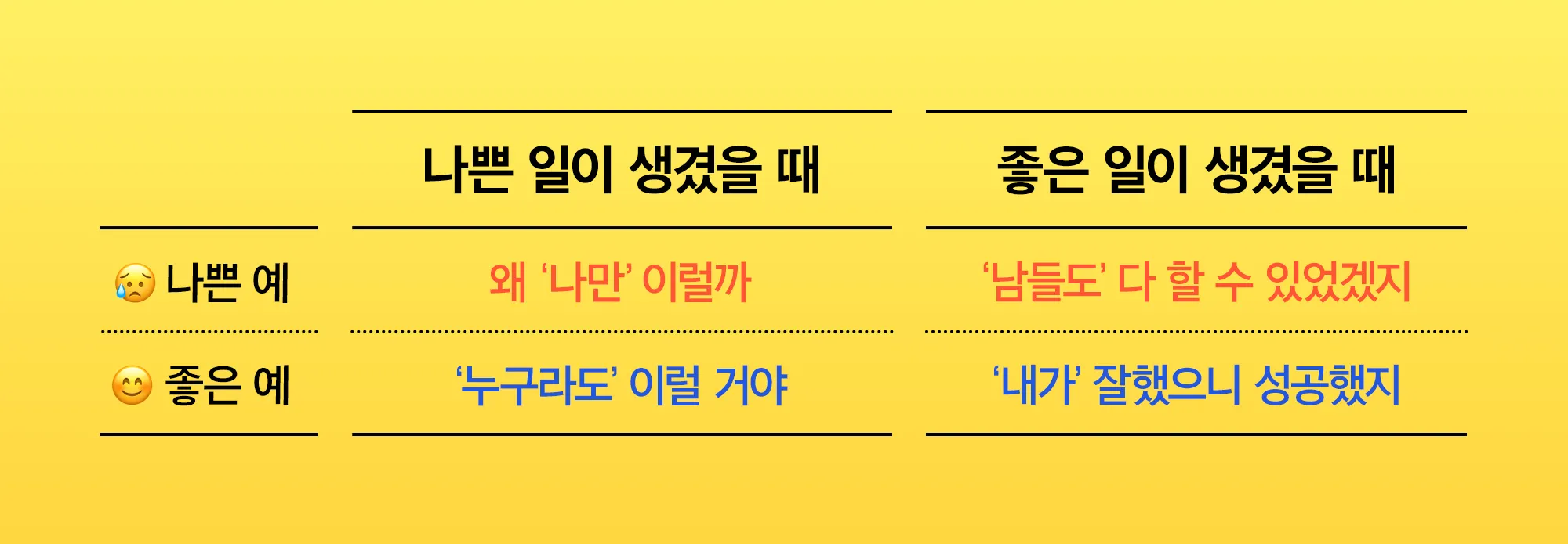 직장인이라면 업무 중 남탓을 하거나 자책하며 스트레스 받는 경우가 많은데요. 개인성, 영속성, 보편성을 바탕으로 상황을 보다 긍정적으로 받아들이고 삶의 용기를 얻을 수 있는 스토리텔링법을 소개할게요.