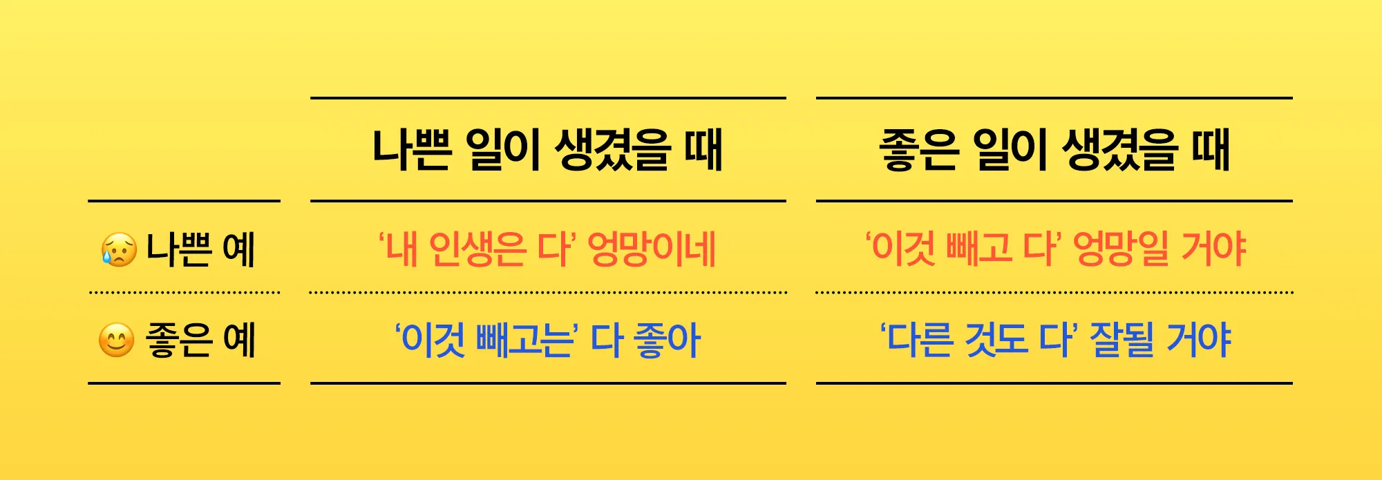 원하던 승진이 됐을 때 이를 특수하게 생각하면 ‘어쩌다 승진은 했는데, 내 인생의 다른 부분들은 엉망진창일 거야’라며 부정적인 방향으로 흘러갑니다. 좋은 일을 나머지 삶에 보편적으로 적용해 보세요. ‘인정받아서 승진도 했으니, 모든 게 잘 풀릴 거야’라고요.