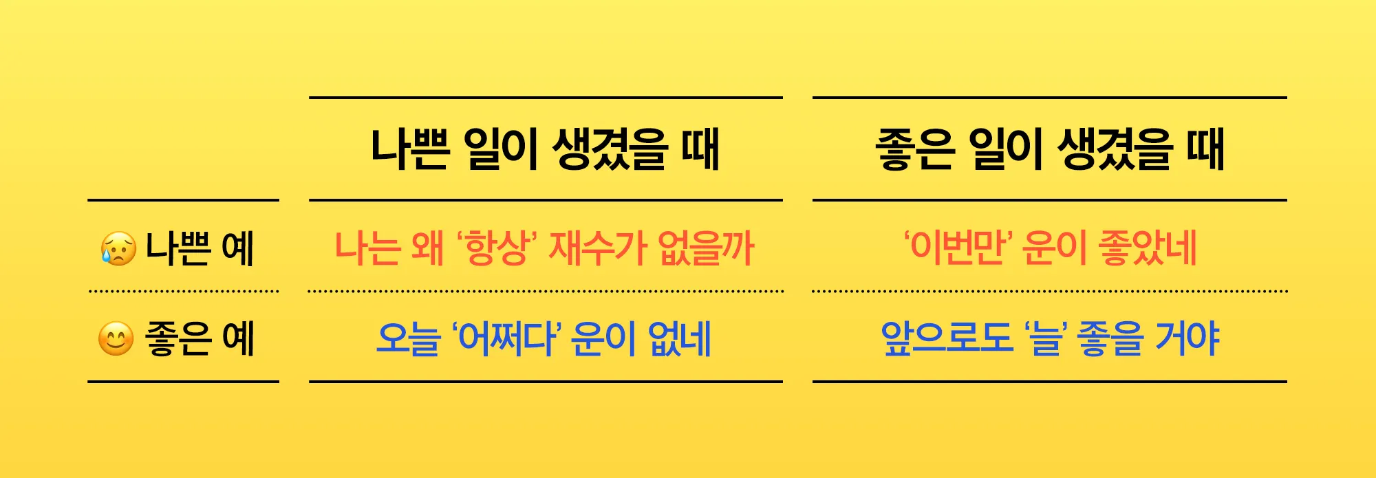 회사에서는 내 잘못이 아닌데 책임져야 하는 일들도 많이 일어납니다. 야근을 하며 부정적인 생각을 이어나가다 보면 ‘왜 항상 나는 재수가 없을까’싶죠. 이때 ‘항상’을 ‘오늘’로만 바꿔봐도 마음이 조금 편해집니다. ‘오늘 어쩌다 운이 나쁘구나’라고 생각해 보는 겁니다.