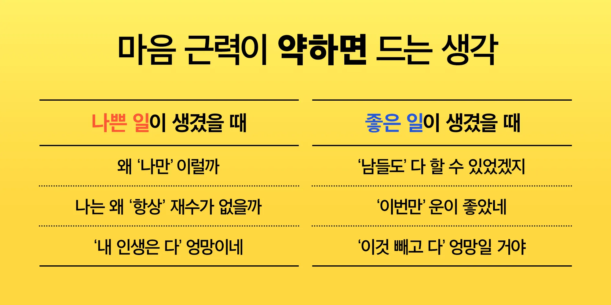 스토리텔링은 개인성·영속성·보편성 3가지 차원에서 이루어집니다. 마음 근력이 약하면, 나쁜 일에 대해 개인적, 영속적, 보편적으로 생각하고, 좋은 일에 대해서는 비개인적, 일시적, 특수적이라고 받아들입니다.