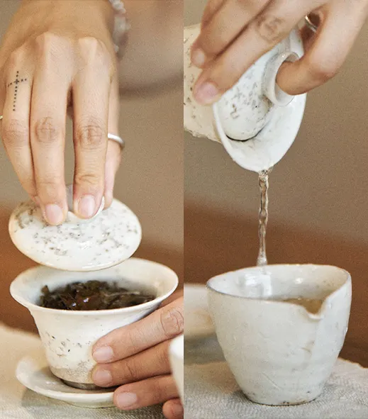 “차 한 잔 먼저 할까요, 백차 괜찮으세요?”