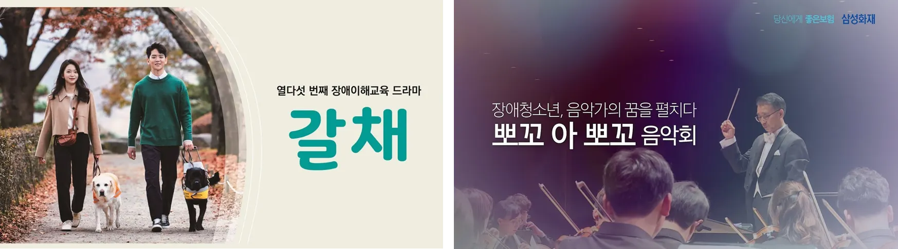 (좌) 장애이해드라마 ‘갈채’ (우) 뽀꼬 아 뽀꼬 음악회 10주년 (출처 : 삼성화재 유튜브)
