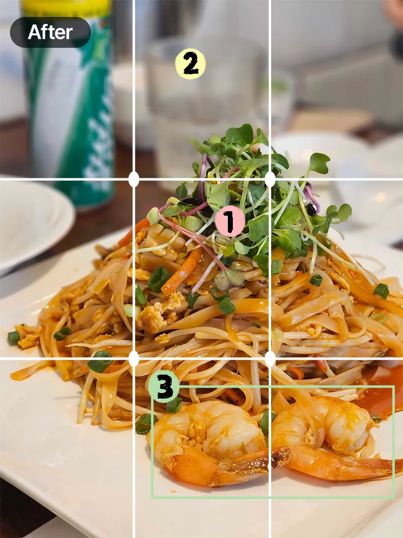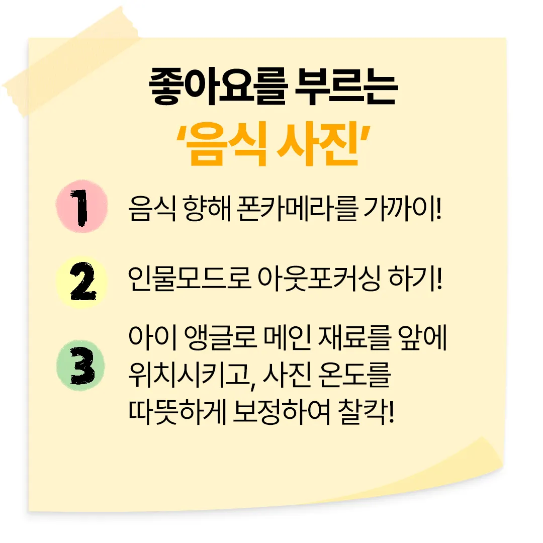 음식 사진은 구도가 80%는 차지해요. 무조건 위에서 아래로 찍는 항공 샷은 NO! 메인 재료를 강조하여 아이앵글(Eye angle)구도로 사진을 찍어보세요. 메인 재료를 돋보이도록 찍고, 인물모드를 활용해서 음식 주변을 아웃포커싱 했더니 더 멋진 사진이 탄생했죠?