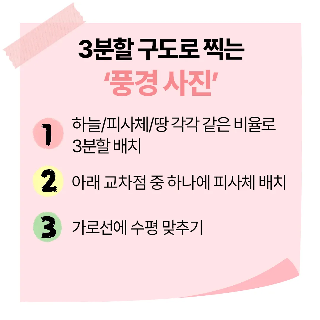 모처럼의 나들이, 멋스러운 풍경을 사진으로 찍어 오랫동안 간직하고 싶나요? 먼저, 주인공이 될 피사체를 결정한 후, 3분할 이미지(하늘, 피사체, 땅)의 아래 교차점에 배치하여 촬영하면 안정적인 구도의 사진이 탄생한답니다. 추가로, 피사체 아래 공간에도 약간의 여백을 남겨준다면 더 자연스러운 사진을 연출 할 수 있어요.