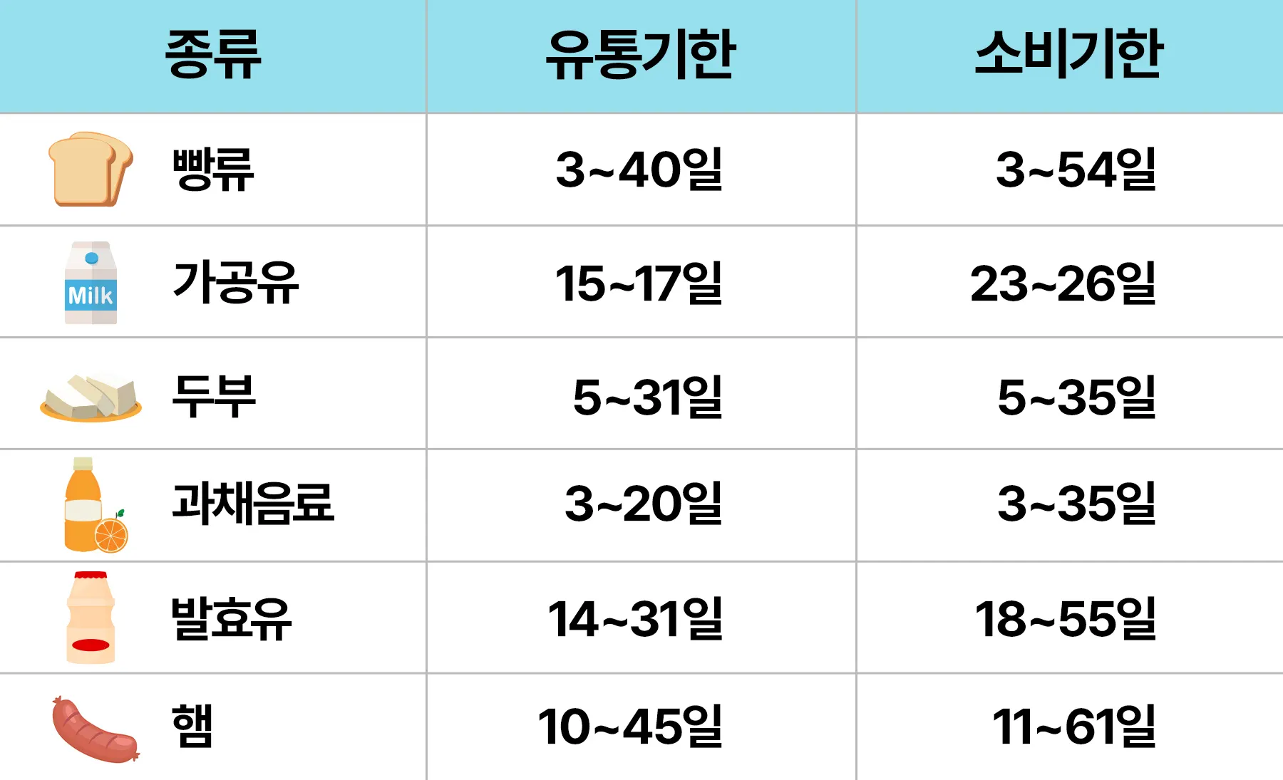 소비기한을 적용하면 우리들이 평소 먹던 식품들의 섭취 가능 기한은 얼만큼 늘어날까요? 아래의 표를 통해 확인해 봐요.