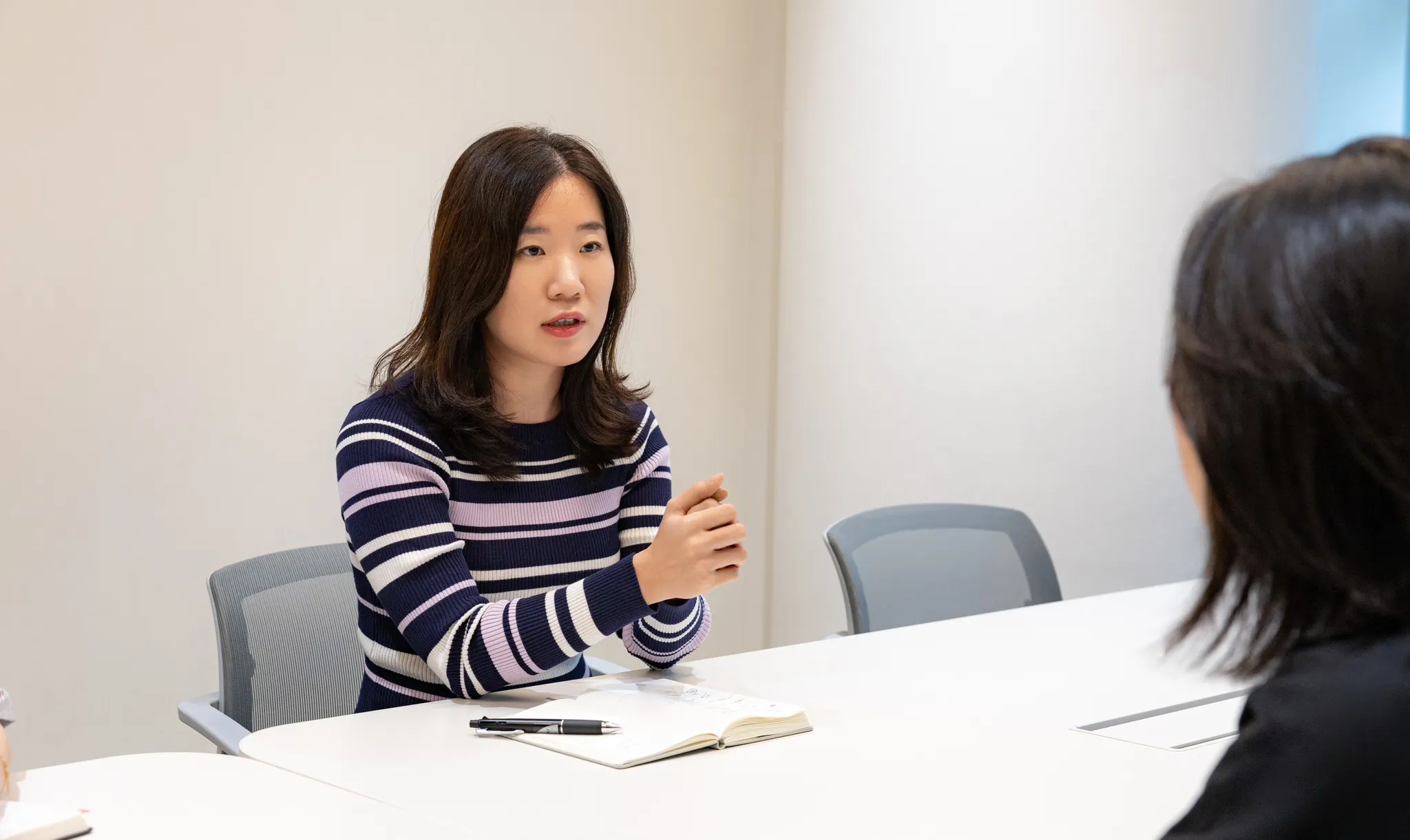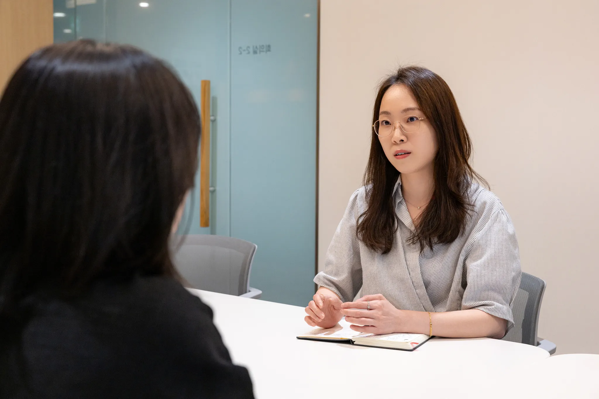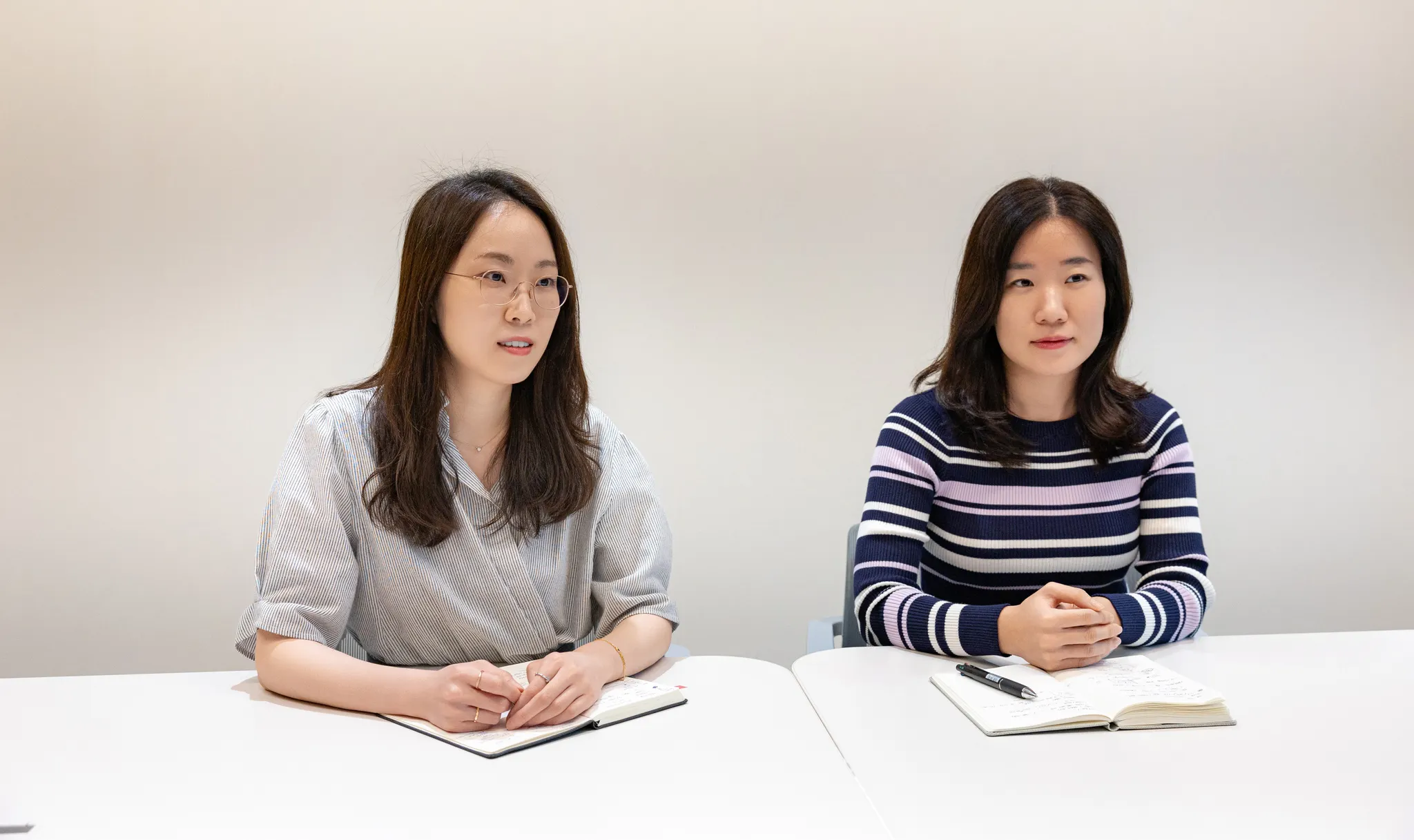 김수련 책임은 '애니핏 플러스'의 총괄 기획자예요. 앱 기획의 전 과정에 투입돼 안정적인 출시와 보완을 이끌어 냈죠. 올해 경력으로 입사한 임상원 책임은 애니핏 플러스의 신규 기능인 'AI 건강관상'을 기획했어요. 두 사람은 남다른 시너지로, 앱의 성장을 도모하고 있어요.