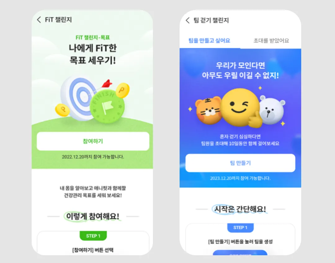 “또한, 지속적으로 건강 관리에 대한 동기부여를 해서 습관이 될 수 있도록 콘텐츠도 구성했어요. 새롭게 선보인 'FIT 챌린지'와 ‘팀 걷기 챌린지’는 건강 관리를 쉽게 시작하고, 꾸준히 실천하는 습관을 만들고자 했어요. 따로 또 같이 건강을 관리할 수 있는 기능으로, 일정 기간 집중적으로 목표 달성을 유도하며, 사용자에게 건강한 긴장감, 성취감, 경쟁 욕구 등을 불러일으켜 줘요.”