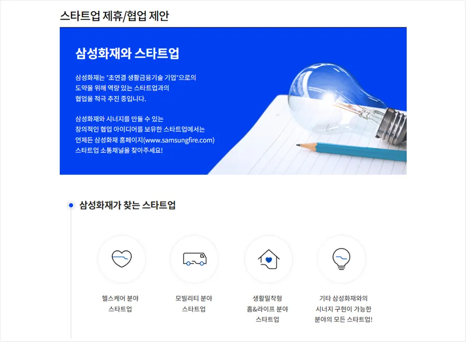 삼성화재 홈페이지, 스타트업 협업 제안 화면