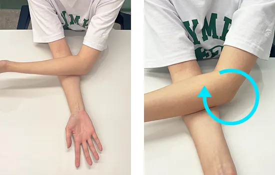 팔을 책상 또는 바닥 위에 올려둔 뒤 반대쪽 팔꿈치를 이용해 가볍게 돌리면서 눌러줍니다.