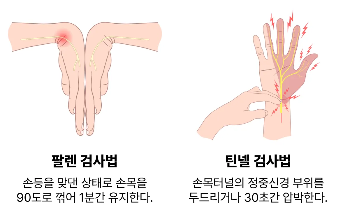두 검사를 실시한 결과 손가락과 손목에 저림을 느낀다면, 손목 터널 증후군일 가능성이 커요!