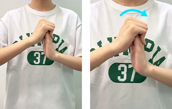 손가락을 웅크린 상태로 만든 뒤, 반대쪽 손바닥을 위로 덮어 그대로 뒤로 젖혀줍니다.