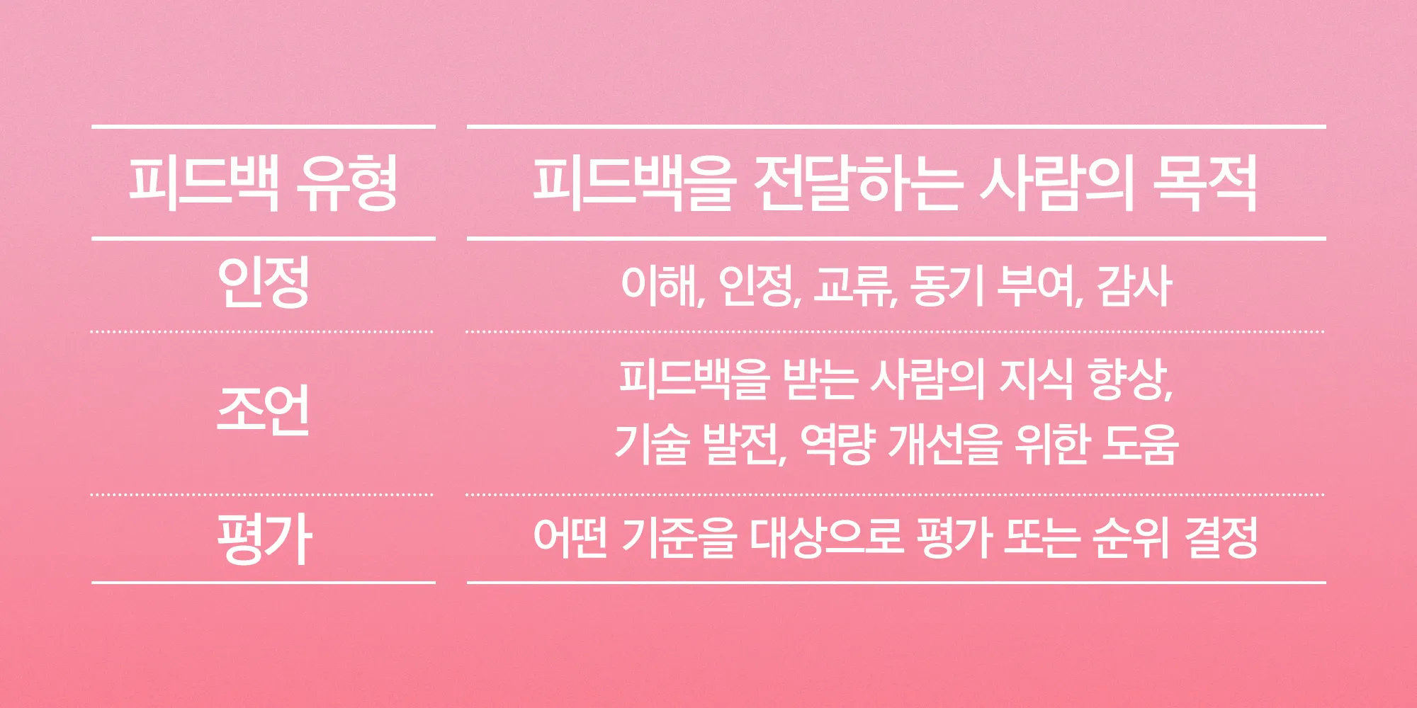피드백은 ‘나에 대한 상대방의 의견’ 정도로 풀이할 수 있는데요. 이때 같은 피드백일지라도 그 안에 숨은 의도가 사람마다 다르다는 사실을 기억해야 합니다. 피드백은 크게 세 가지 종류로 분류할 수 있어요. 피드백으로 오해가 생기는 이유는 각자 원하는 피드백 종류가 달랐기 때문입니다.