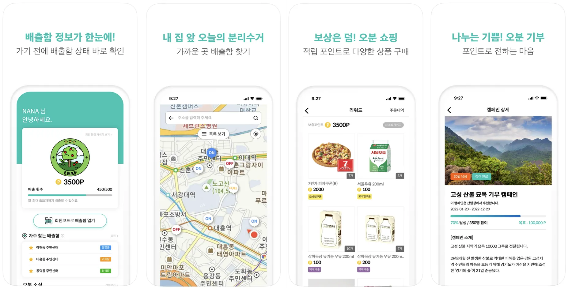 재활용 가능한 쓰레기(투명 페트병, 캔, 우유팩 등)를 분리수거하면 포인트를 적립해 주는 앱이에요. 앱을 다운받아 회원 가입하면 가까운 배출함 정보를 알려주는데요. 배출함에 있는 스캐너에 회원 코드를 입력 후 분리수거한 쓰레기를 넣으면 포인트를 적립할 수 있어요. 적립된 포인트는 앱과 연결된 쇼핑 코너(오분 쇼핑)에서 상품으로 교환하거나 기부할 수 있습니다.