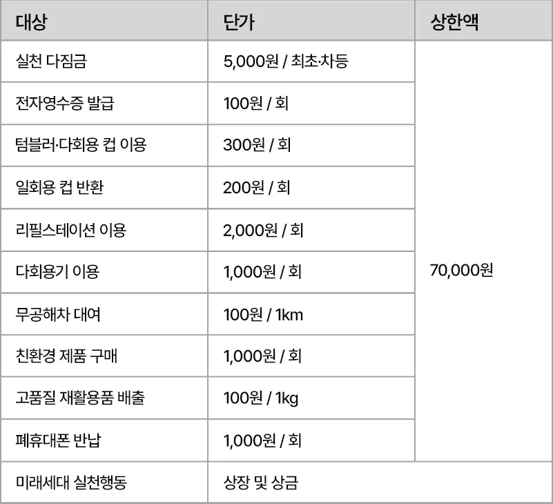 일상생활 속에서 친환경 활동을 실천하면 포인트를 제공하는 제도. 적립된 포인트는 계좌이체하여 현금처럼 사용할 수 있어요!