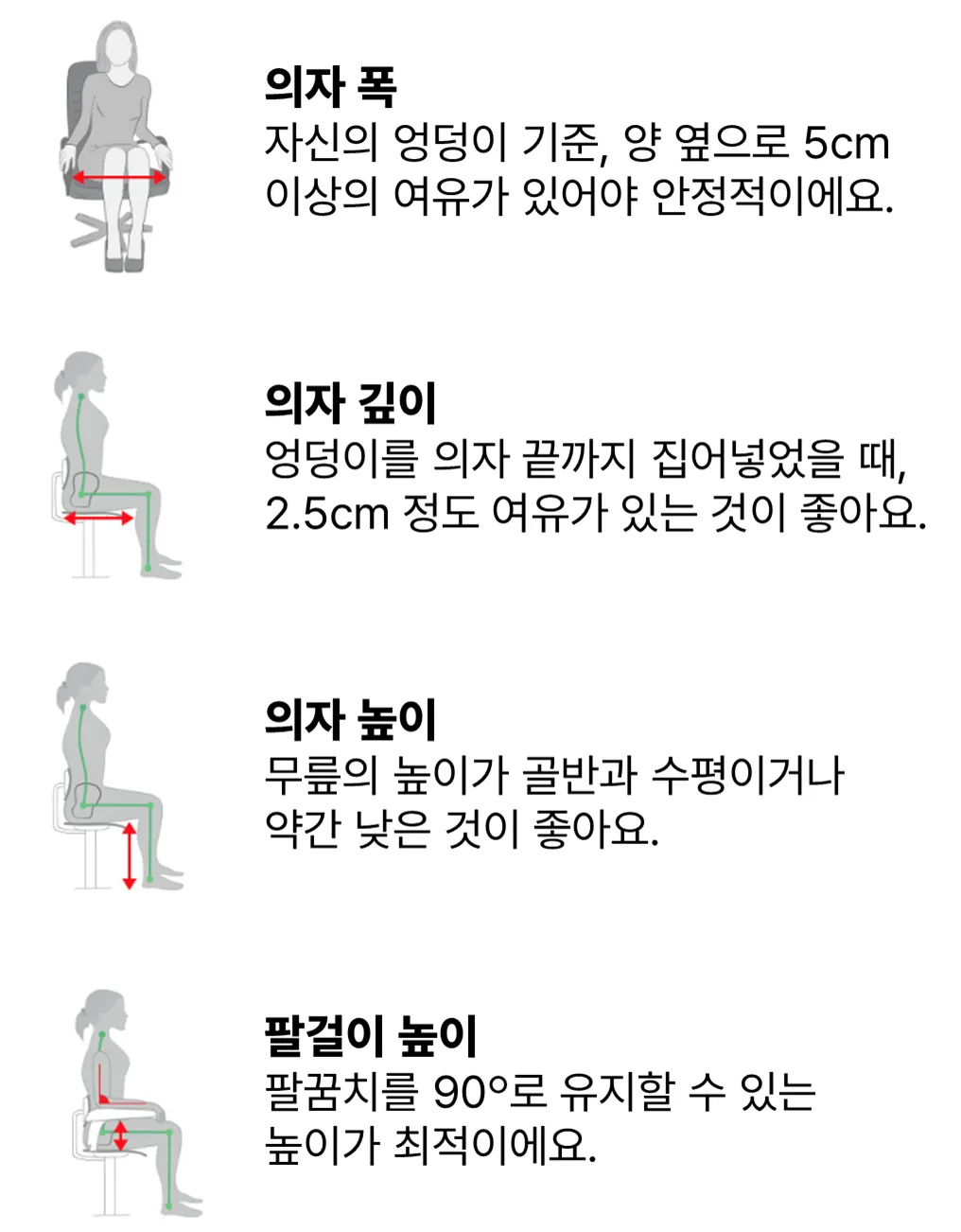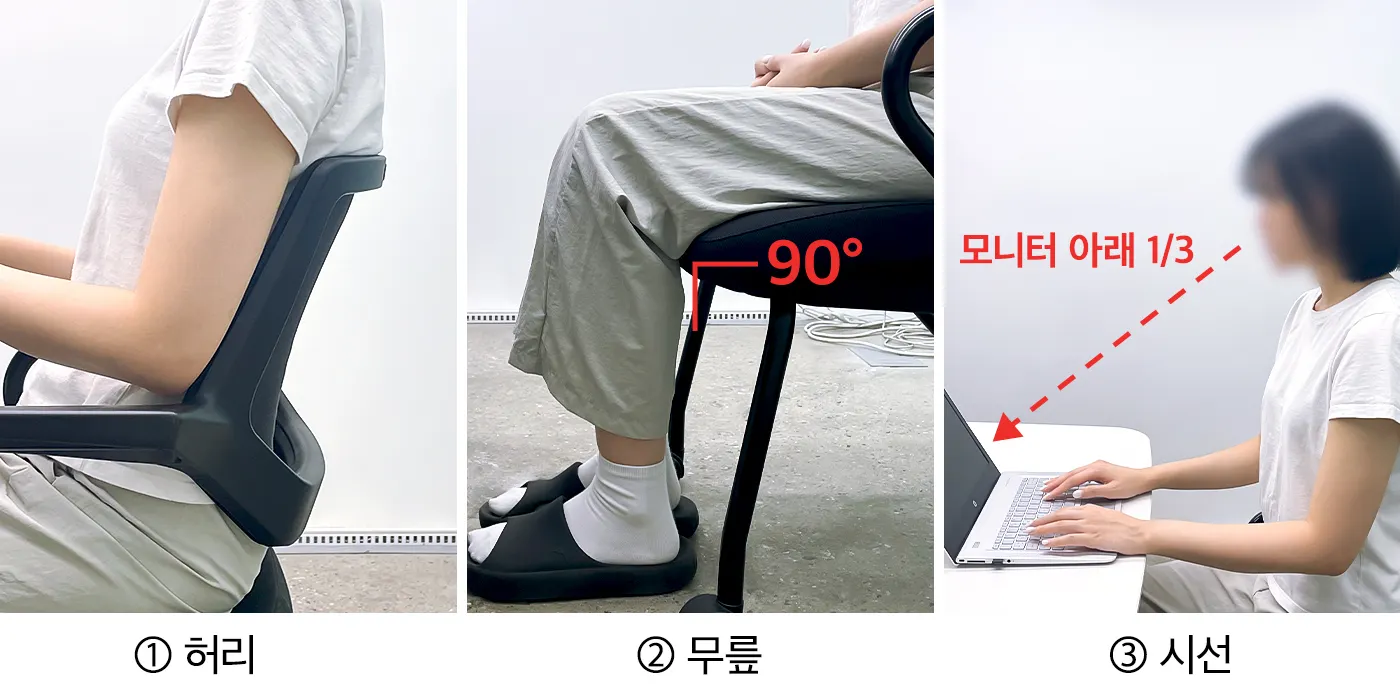 ①엉덩이를 의자 안쪽으로 깊숙이 집어넣고 허리는 등받이에 완전히 붙여 주세요. 이때, 등받이는 척추가 안정적으로 기댈 수 있도록 견갑골 하부까지 받칠 수 있는 높이어야 해요. 등받이가 없는 의자는 많은 하중과 압력이 허리로 집중되기 때문에 가능한 피하는 게 좋아요. ②무릎은 90°를 유지하고, 의자의 높이는 무릎이 골반보다 약간 낮거나 같도록 조정해 주세요. ③컴퓨터 모니터를 볼 땐 턱을 아래로 가볍게 당긴 상태에서 모니터 아래쪽 기준 1/3 지점에 눈높이를 맞출 수 있게끔 모니터 위치를 옮겨 주세요.