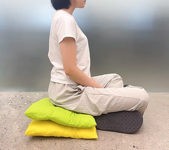 양반다리의 변형에 가까운데요. 방석을 2개 정도 포갠 뒤 엉덩이 밑에 깔아 양반다리 자세를 취하면, 엉덩이가 다리보다 높게 위치하여 허리가 편안해지고, 다리에 힘이 들어가 보다 안정적인 자세를 만들 수 있어요!