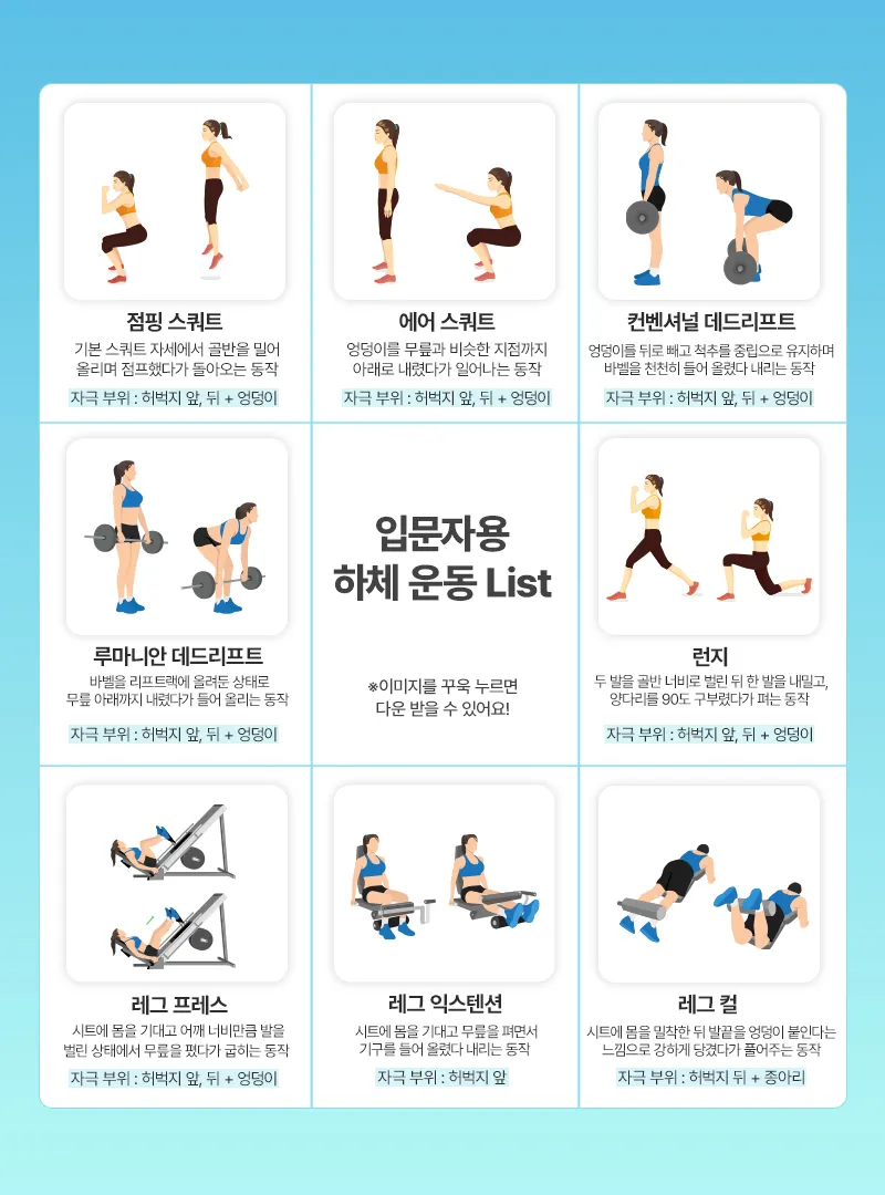 본격적인 운동에 앞서 우리는 탐색의 단계를 거쳐야 합니다. 이 기구가 뭔지, 이 동작이 내게 맞을지를 알고 시작하는 것과 모르고 시작하는 것은 천지 차이거든요. 운동 초보자라서 선뜻 기구에 손도 못 대본 분, 명칭이 기억나질 않아 검색조차 못 해보고 패스하신 분! 이제 걱정하지 마세요. 아래 적힌 설명을 보면 쉽게 접근할 수 있을 거예요. 이미지를 다운 받고 하체 운동할 때 참고하세요!