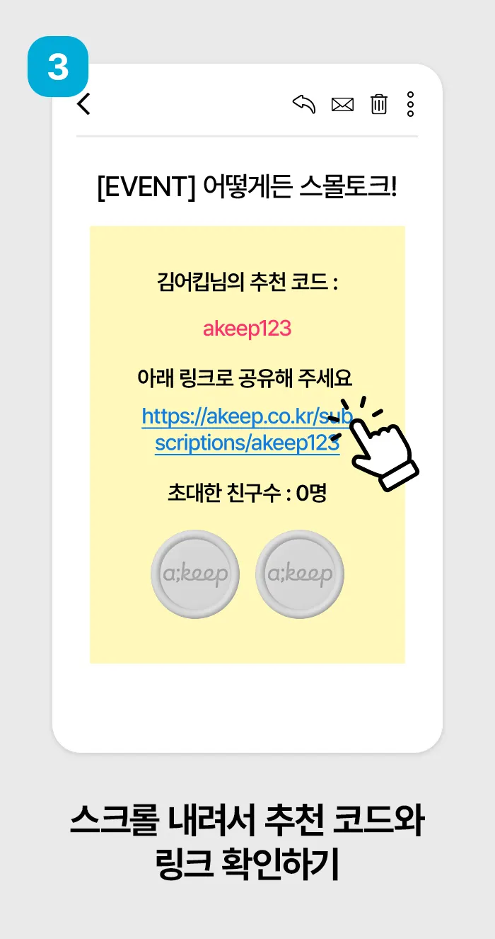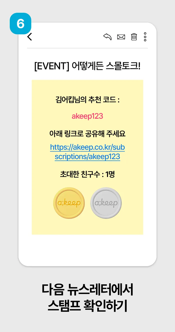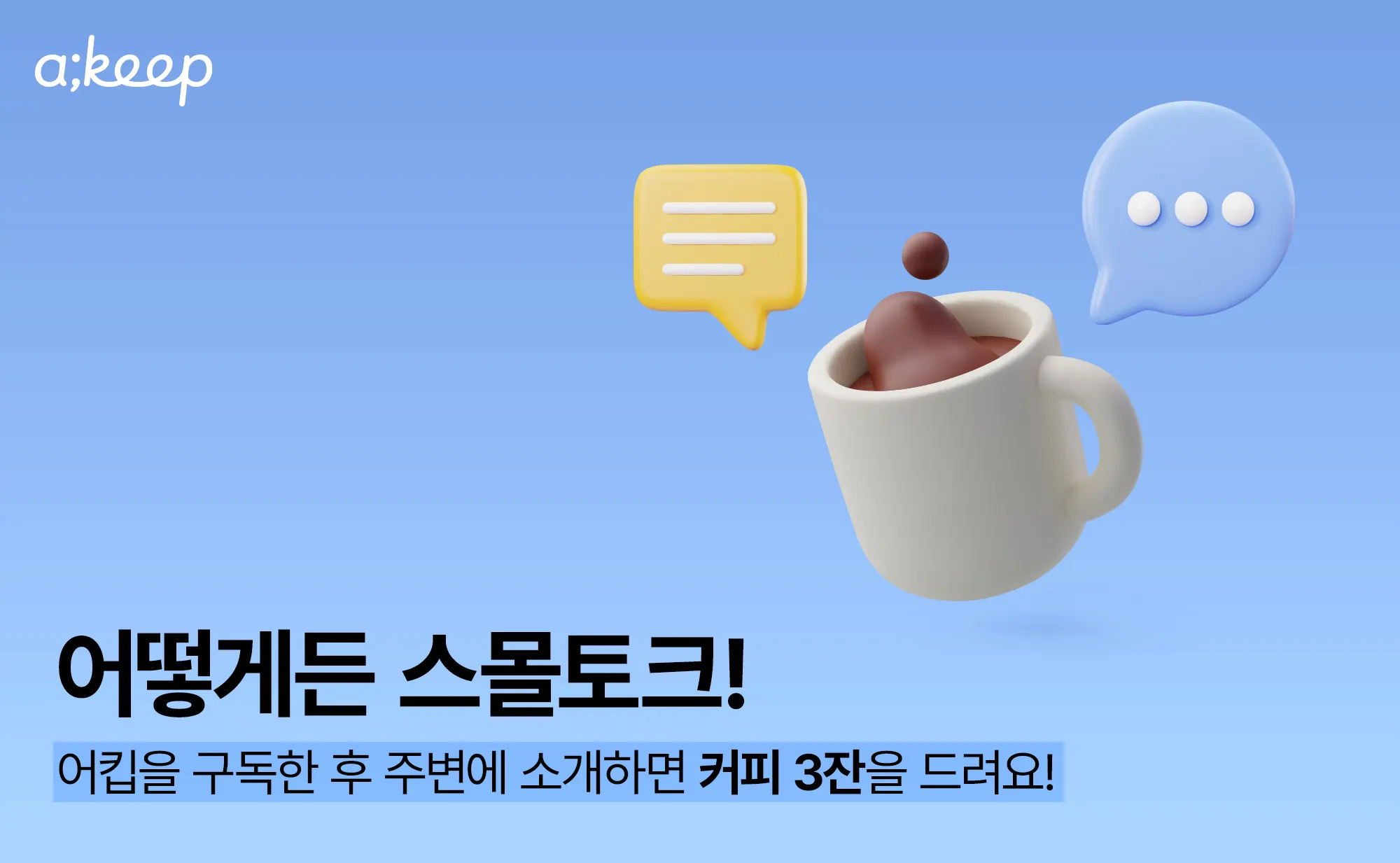 뉴스레터 어킵을 구독하세요. 그리고 지인 2명에게 추천해 보세요. 이벤트 기간 안에 2명이 모두 구독하면 커피 쿠폰을 드려요!